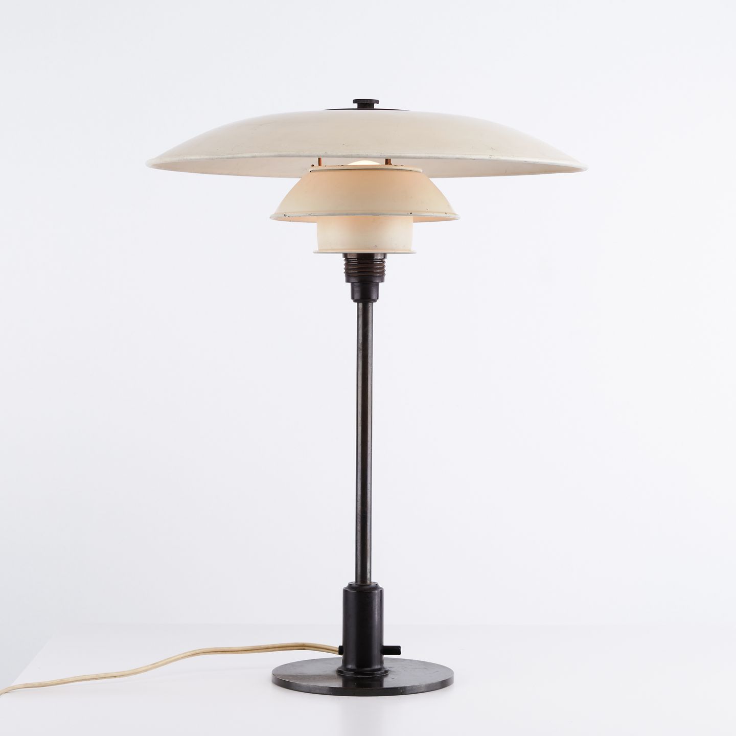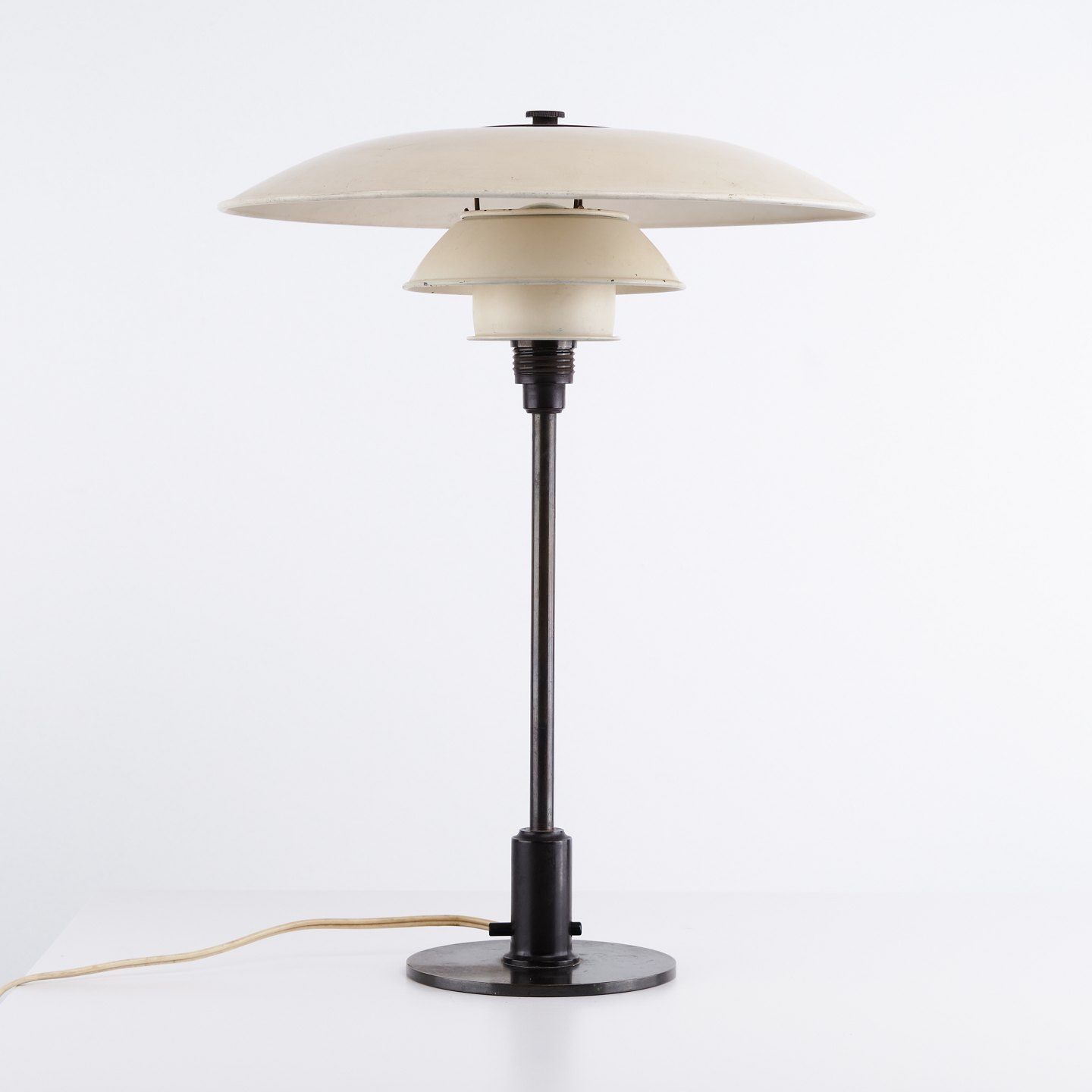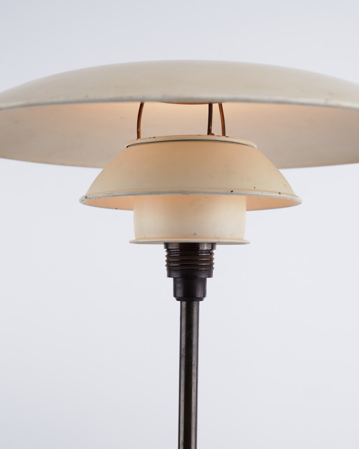 PH 3,5/2,5 bordlampe designet af Poul Henningsen og fremstillet af Louis Poulsen i 1930’erne. Lampen er udført med hvidmalede metalskærme, som sikrer et blødt og jævnt fordelt lys.